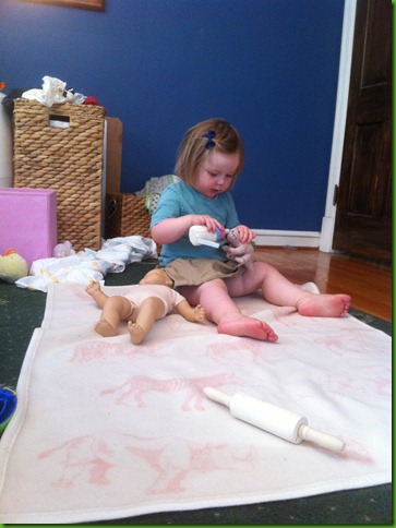 Today at lunch, Margaret was a little recalcitrant and squirrely, because her grandmother had taken her swimming this morning which tires her out. This is a good thing, because currently she is asleep in her room, and Ellie is in the living room like so: